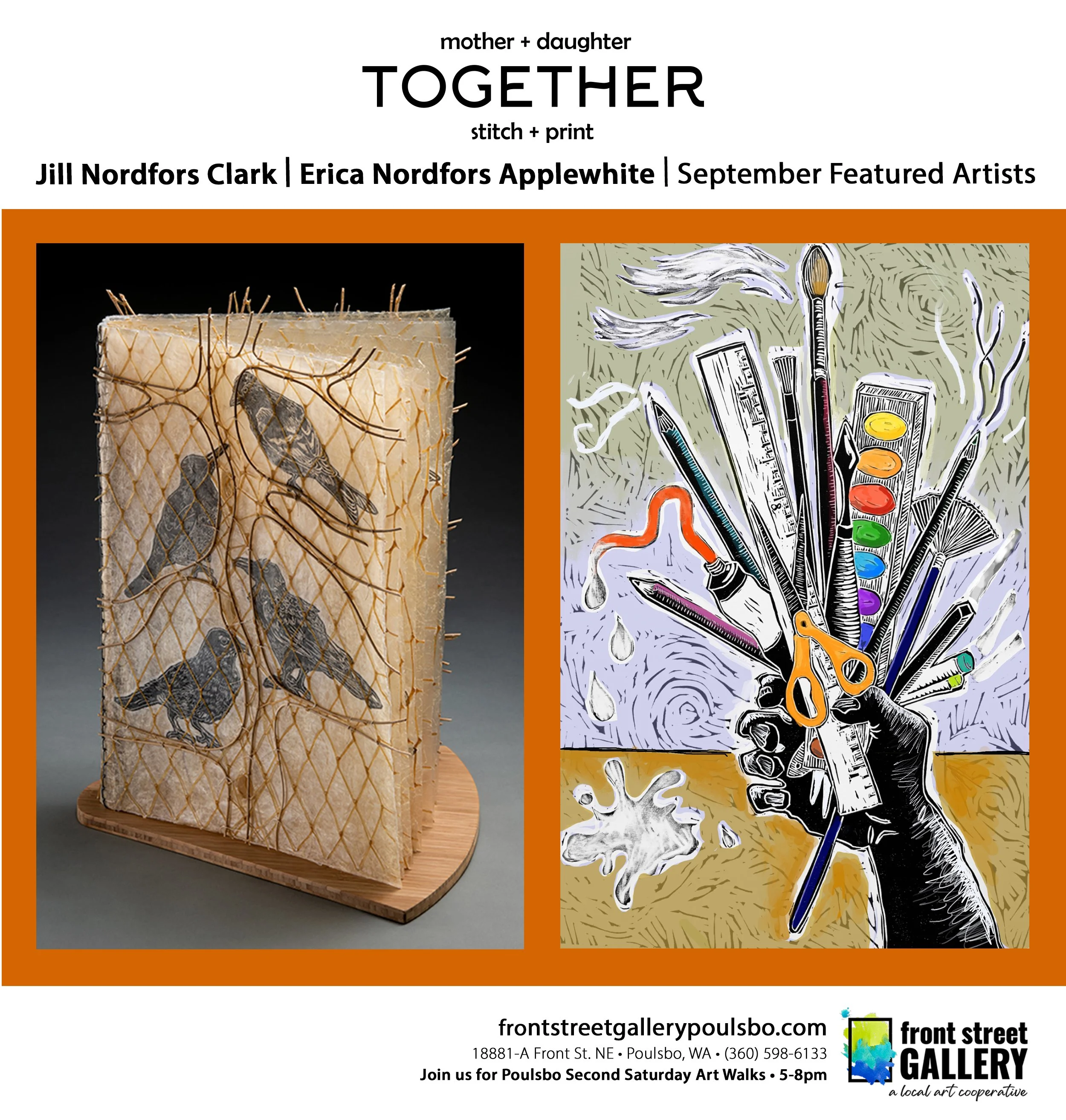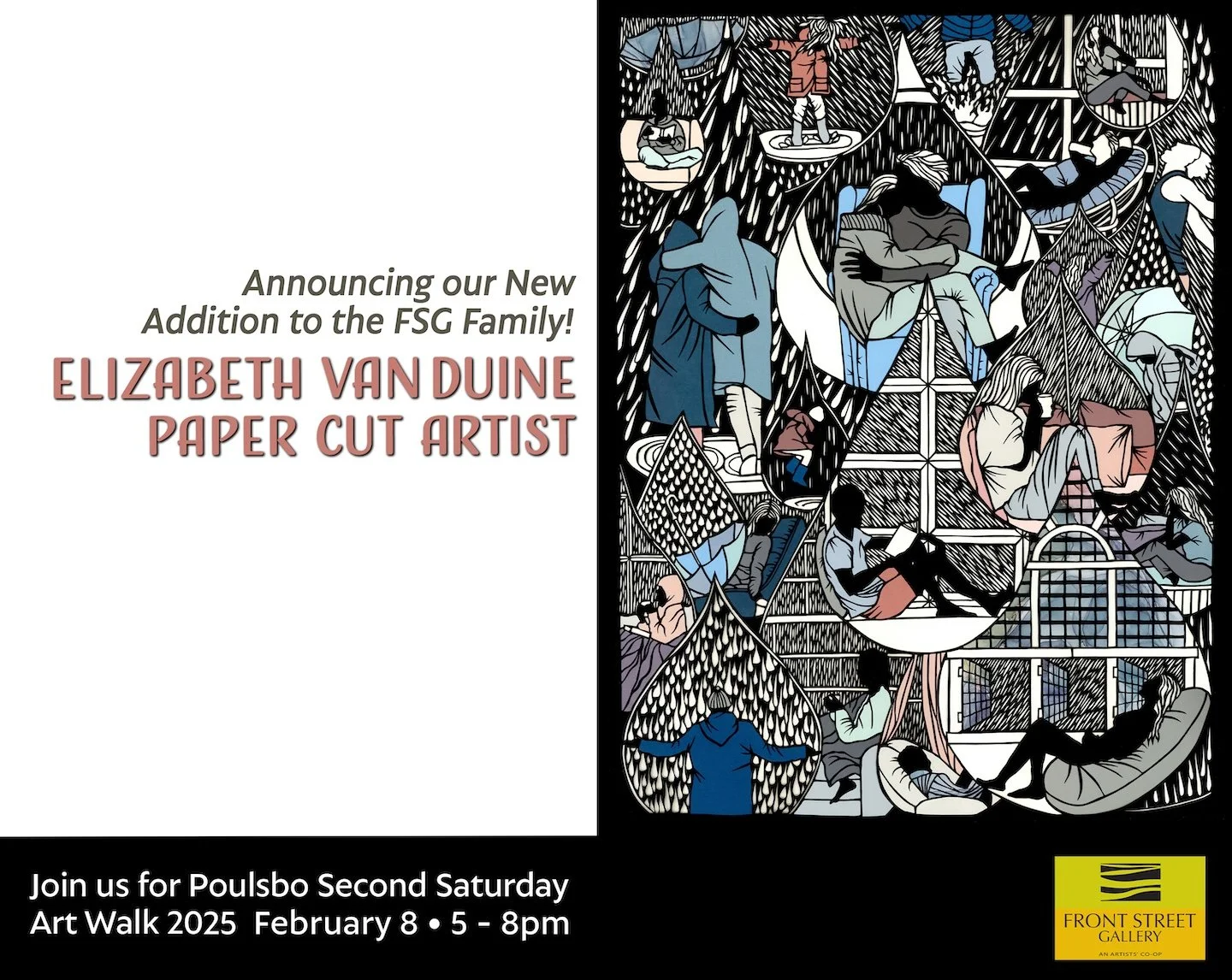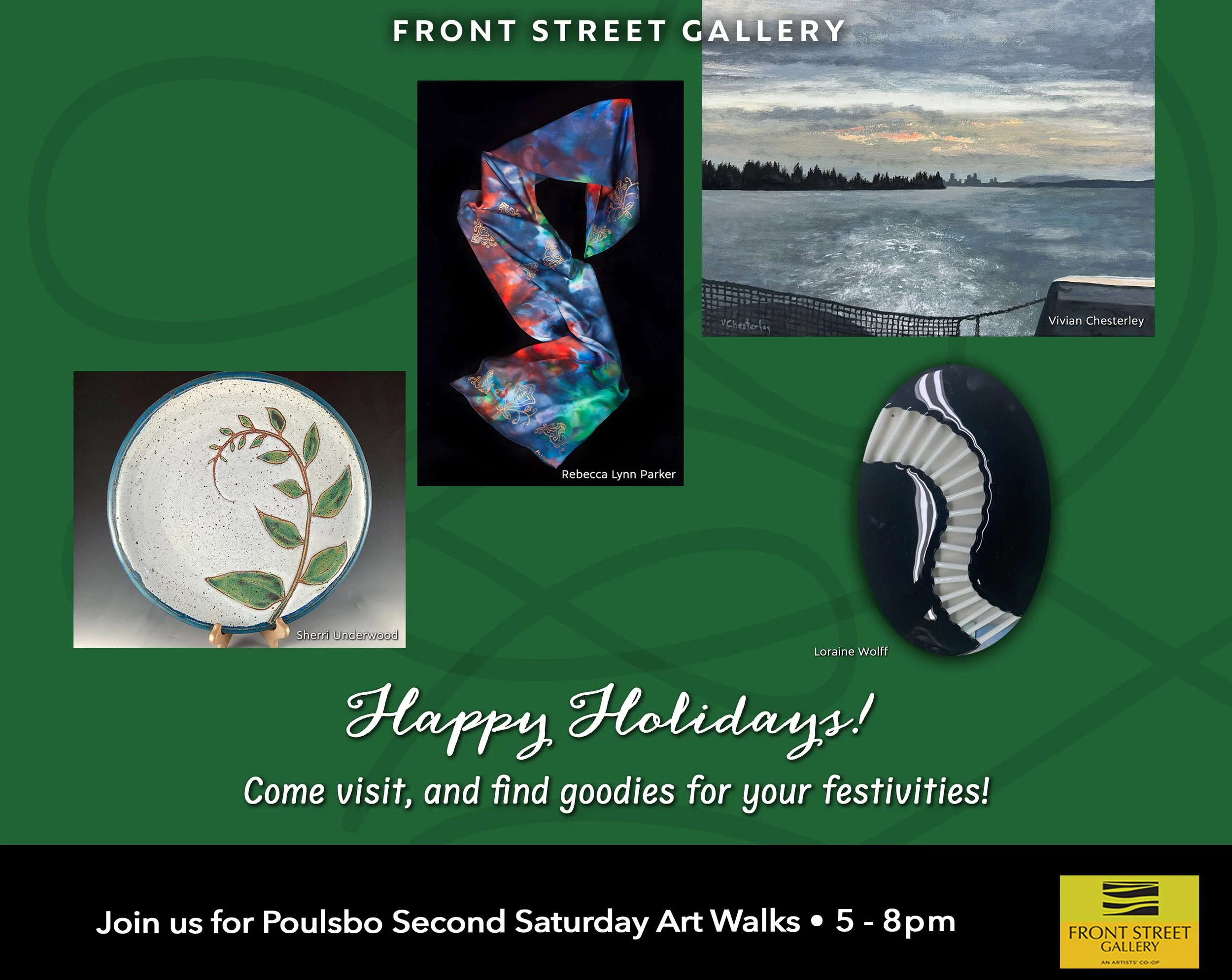 Join many local businesses in historic downtown Poulsbo for an evening of gallery hopping, shopping, and dining on the Second Saturday of each month from 5-8 pm. Front Street Gallery opens a new show every month with the featured artist's opening reception as part of the Art Walk. Come in and meet local artists, mingle and enjoy refreshments.