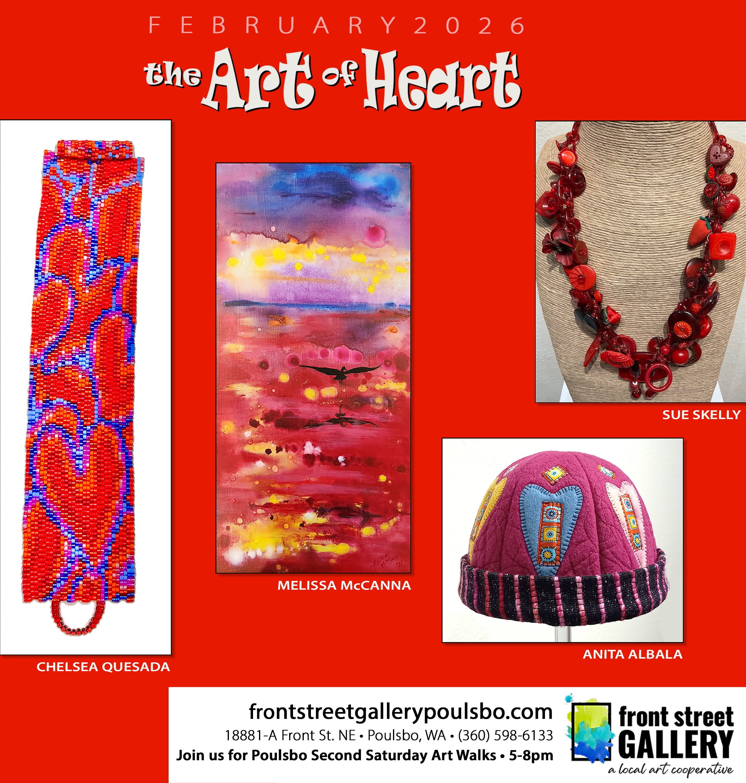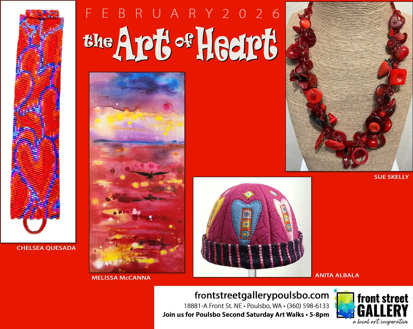 Join many local businesses in historic downtown Poulsbo for an evening of gallery hopping, shopping, and dining on the Second Saturday of each month from 5-8 pm. Front Street Gallery opens a new show every month with the featured artist's opening reception as part of the Art Walk.